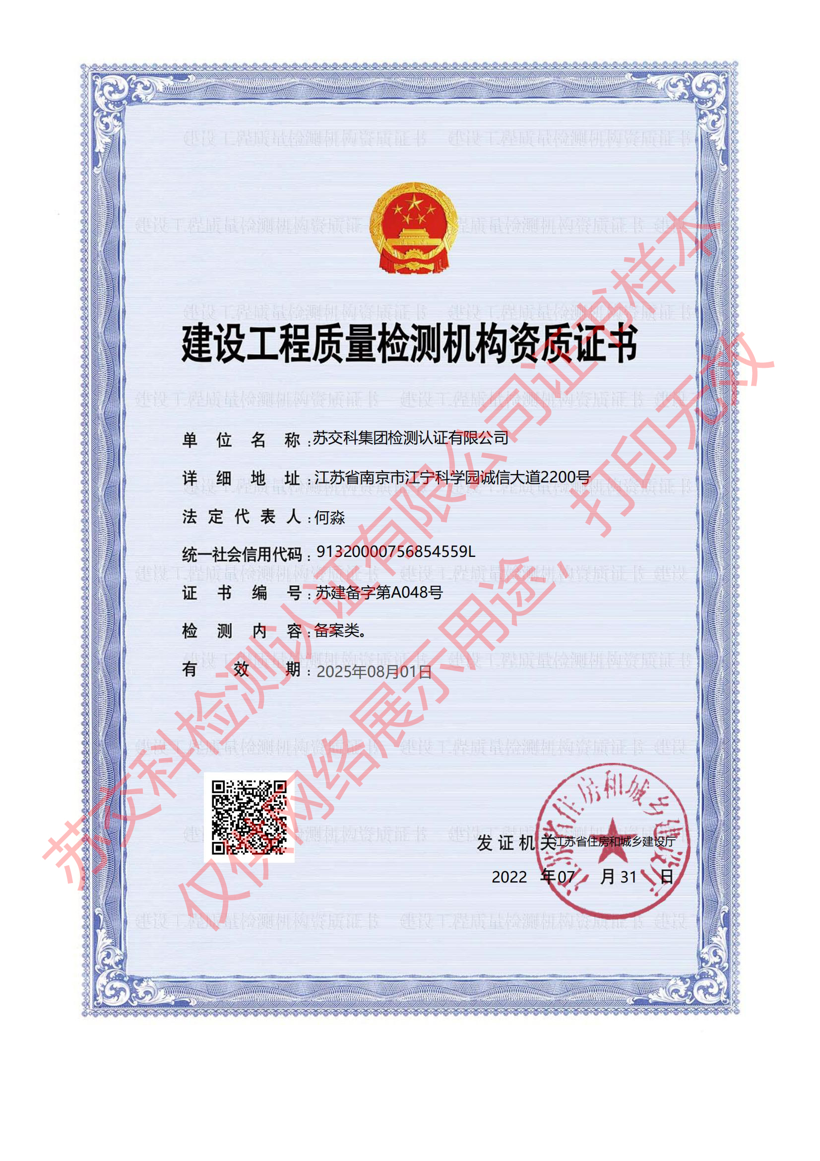 蘇交科檢測(cè)認(rèn)證建設(shè)工程質(zhì)量檢測(cè)機(jī)構(gòu)資質(zhì)證書(備案類)
